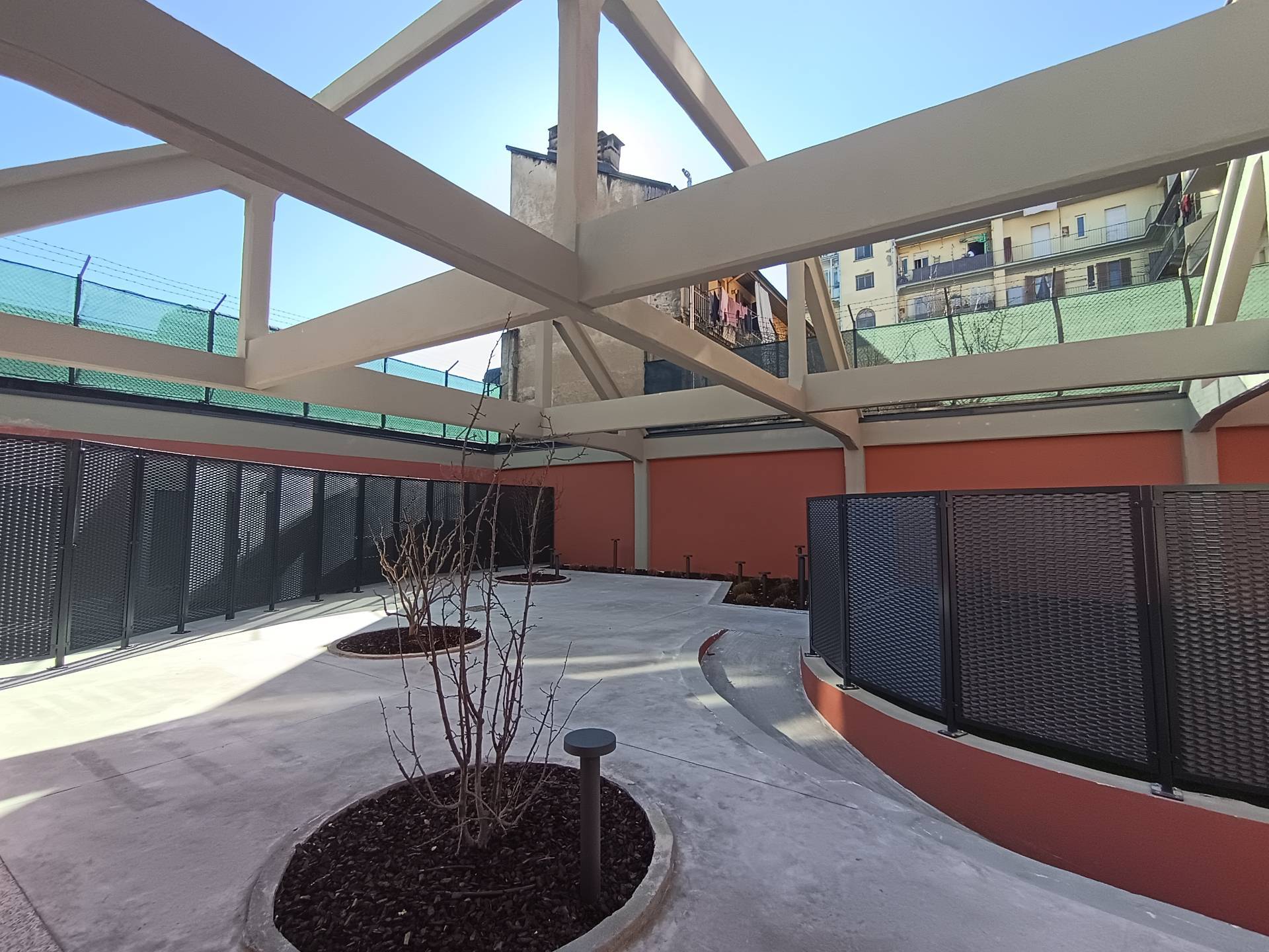 Nel progetto è stata posta particolare attenzione alla struttura industriale preesistente la quale, sgombera dagli elementi orizzontali di copertura, viene ora integrata nel disegno dello spazio a cortile assumendo valore di archeologia industriale.